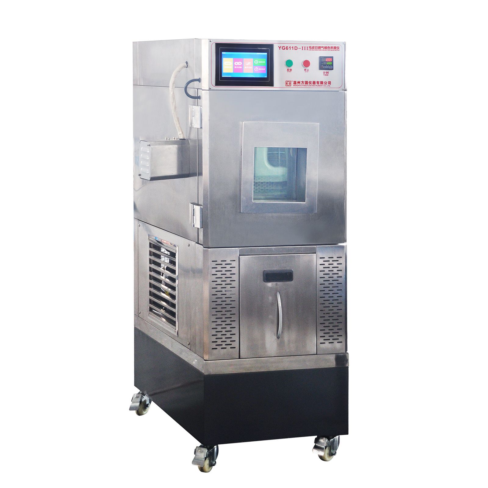 YG611D-III毛皮日曬氣候色牢度儀可以將試樣24小時曝露在模擬日光條件下,試樣經受的連續曝曬效果遠超室外曝曬,因而可以加速獲得試驗結果。